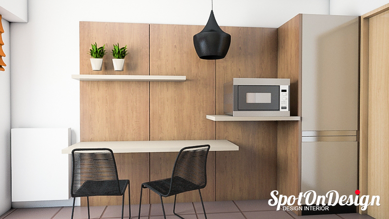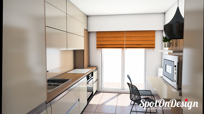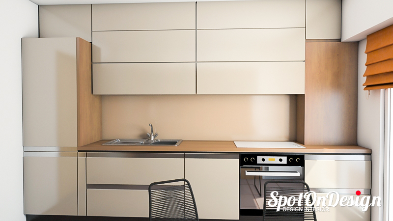 Mobila de bucătărie a fost executată la comandă, cu o compartimentare foarte atentă pentru a rezolva problema spațiilor de depozitare. A fost ascunsă și centrala în corpul de la geam. Zona de luat masa este acompaniată de o placare ampla cu pal pe peretele adiacent, cu un efect excepțional.