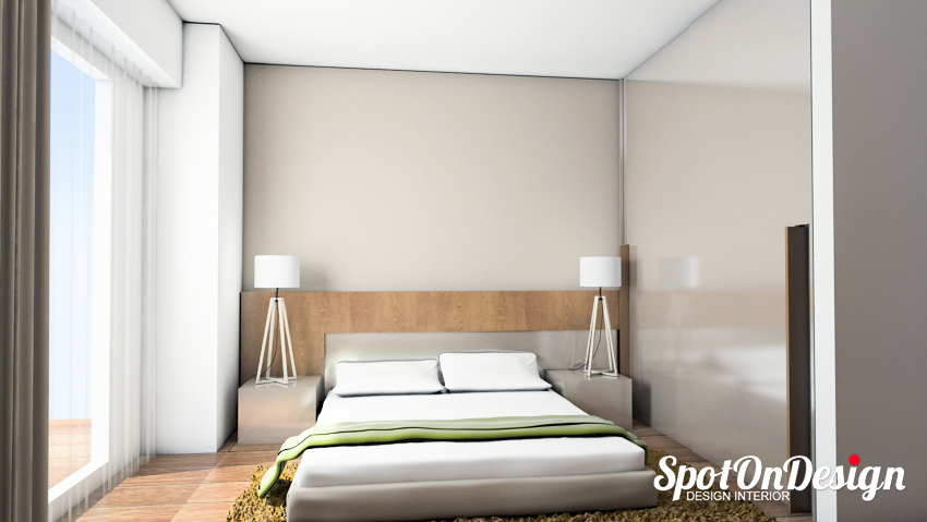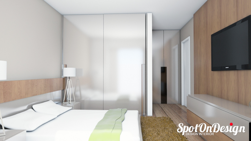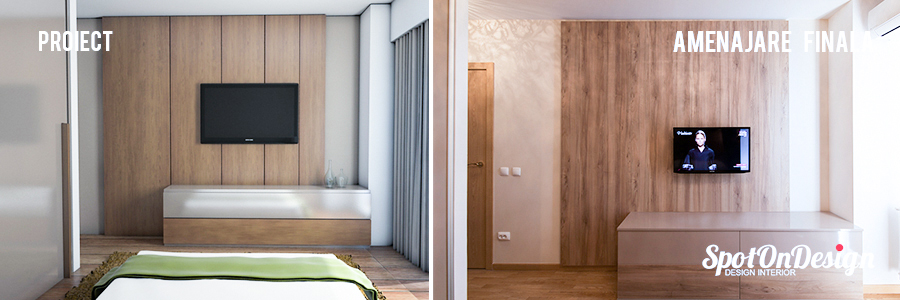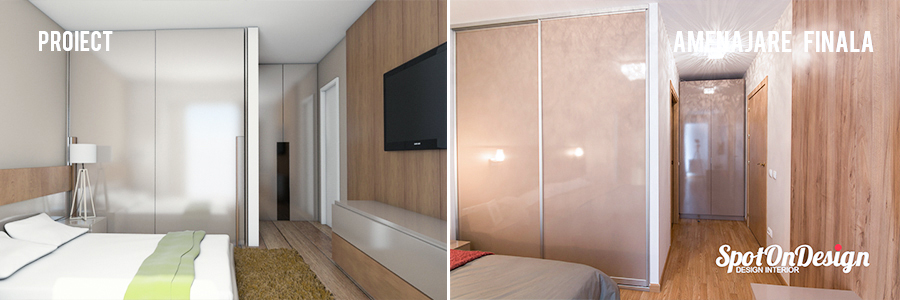 Surpriza cea mai mare este chiar acest dormitor, mic și aparent neîncăpător. Prin folosirea dressingului (caruia i s-au schimbat ușile glisante) și completarea spațiilor de depozitare cu încă un dressing plasat dupa ușă, s-a rezolvat chestiunea stocarii hainelor.