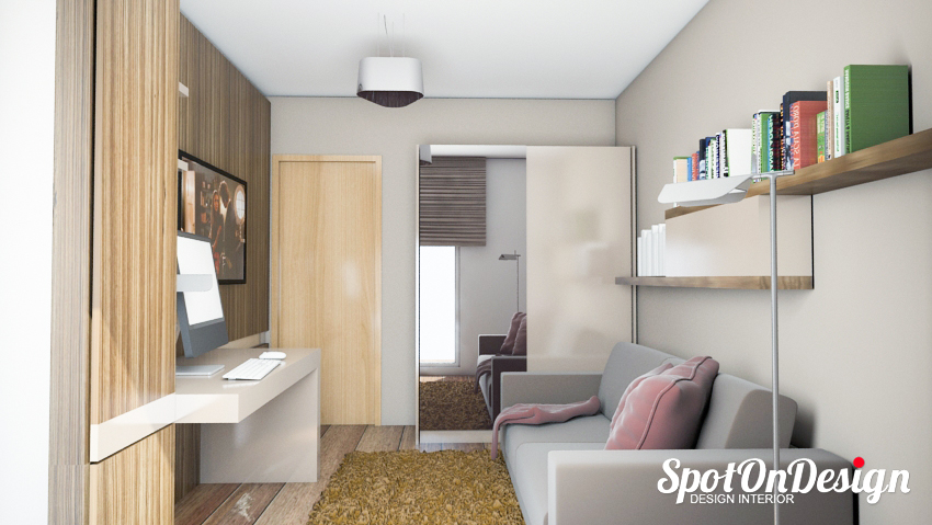 Al doilea dormitor al apartamentului este deghizat în birou, cele două funcții păstrându-se indiferent de starea canapelei extensibile. Când cineva folosește camera pe post de dormitor, spațiul rămas la capatul patului permite utilizarea normală a biroului.